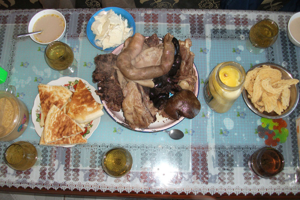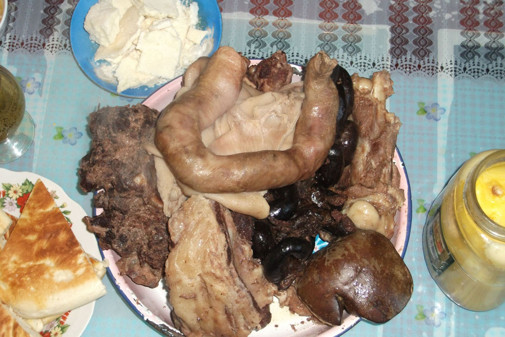 骨付きの羊と骨付きの牛と肝臓(レバー)と腸詰め(ソーセージみたいなもん)と皮を煮る伝統料理。